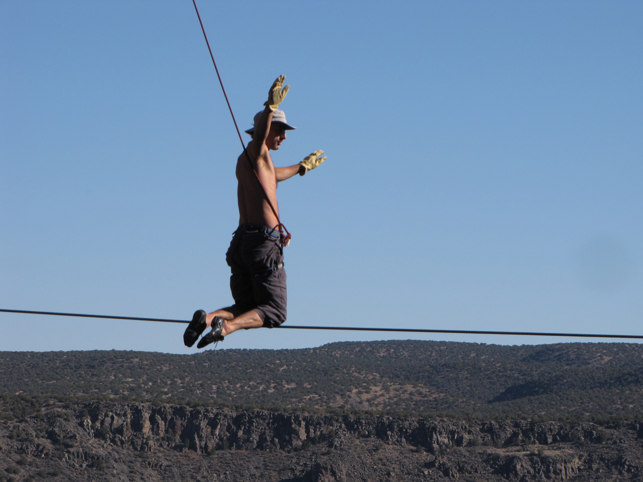 They look to the ground, to the feet, allowing the first understanding of the true environment. It is huge, the ground is farther away than the walls of the gorge which farther down stream joins the Rio Grande. The river looks so small, how does it quench the thirst of some many? Does it even survive to join the sea during the spring snow melts? No, I think it dies somewhere in Texas, drunk to the point it becomes cracked earth. Both hands latch onto the wire and the body curls up over the wire to become seated again. Now to press up to standing in a moment of faith. Now the dance of balance begins again. The end of the wire is approaching, now it is time to turn. The balls of the feet lift and the body spins 180 degrees. The eyes reach out hard to grasp the cable, but the body is no longer over the wire. A legs swings up to catch the balance, but it is not right either, and faster than the mind can command, the body draws itself toward the wire to embrace it. The hands have reached out and grabbed the wire tightly. A leg hooks and curls around the hard steel rope. The fall creates a momentum which will be used in the next instant to regain the perch atop the wire. Back above the wire it is best to be not haunted by the fall. Its only use now is a release, a shedding of tension towards creating a more fluid dance of uncertainty. The fall waits, to deny it is impossible. It is this uncertainty that makes the dance of the rope extraordinary. If the fall absolutely could be avoided, the beauty of the act would be diminished. But to miss the wire in a fall, to not embrace it with intense power, but to let it slip from the grasp is terrifying. It should never happen.