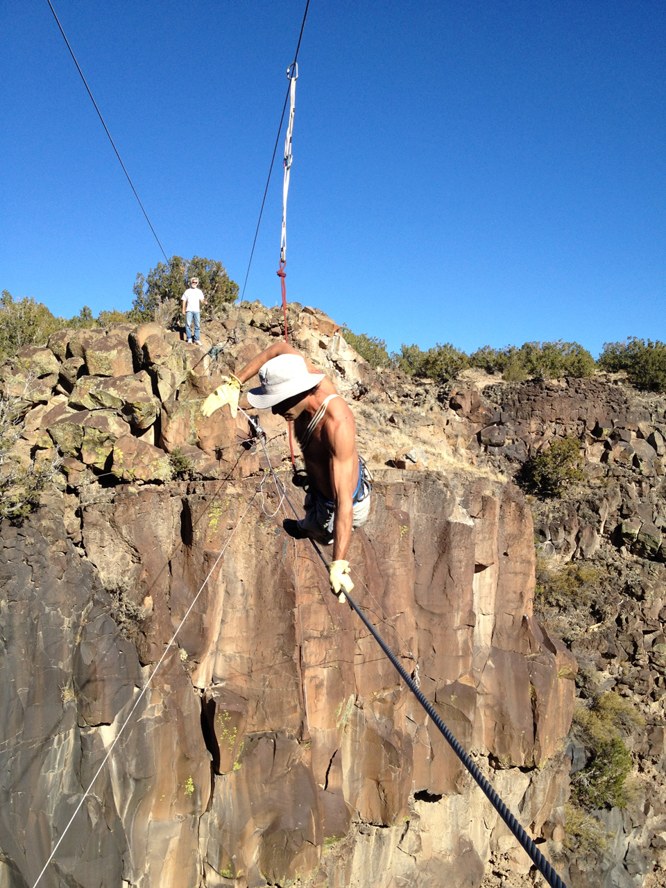 Looking at it I wish I had more footage of the other participants, Chuck and Darien, helping and watching the walking and setting up the rigging, for the participation of others is so much a part of what makes this process amazing and exciting to me. But in the midst of such a complicated endeavor I decline to split my focus between rigging and filming. At this point the documentation of the process invites collaboration as well. Perhaps I can find a film student at one of the schools in Santa Fe who might be interested in creating a piece with me, but honestly where I want to carry the work forward is bringing people to witness the actual installation and act. In person you feel the wind, can walk to the gorge’s edge, and can touch the taught lines sensing their stored energy. You feel the vastness of the exposure barely tamed by the slender and elegant arcs of wire and ropes crossing from one side to the other. You sense the beauty of it all in an awesome landscape. The couple of friends who made the journey to witness my activities said they were inspired by the intensity and skill of the endeavor and encouraged me to continue my practice while seeking more public exposure. Maybe with this work a new type of interaction with the viewer has yet to be discovered, who knows, it all feels so new. For the first time in this project I have the feeling the direction I am traveling in is yielding something exciting and tangible.